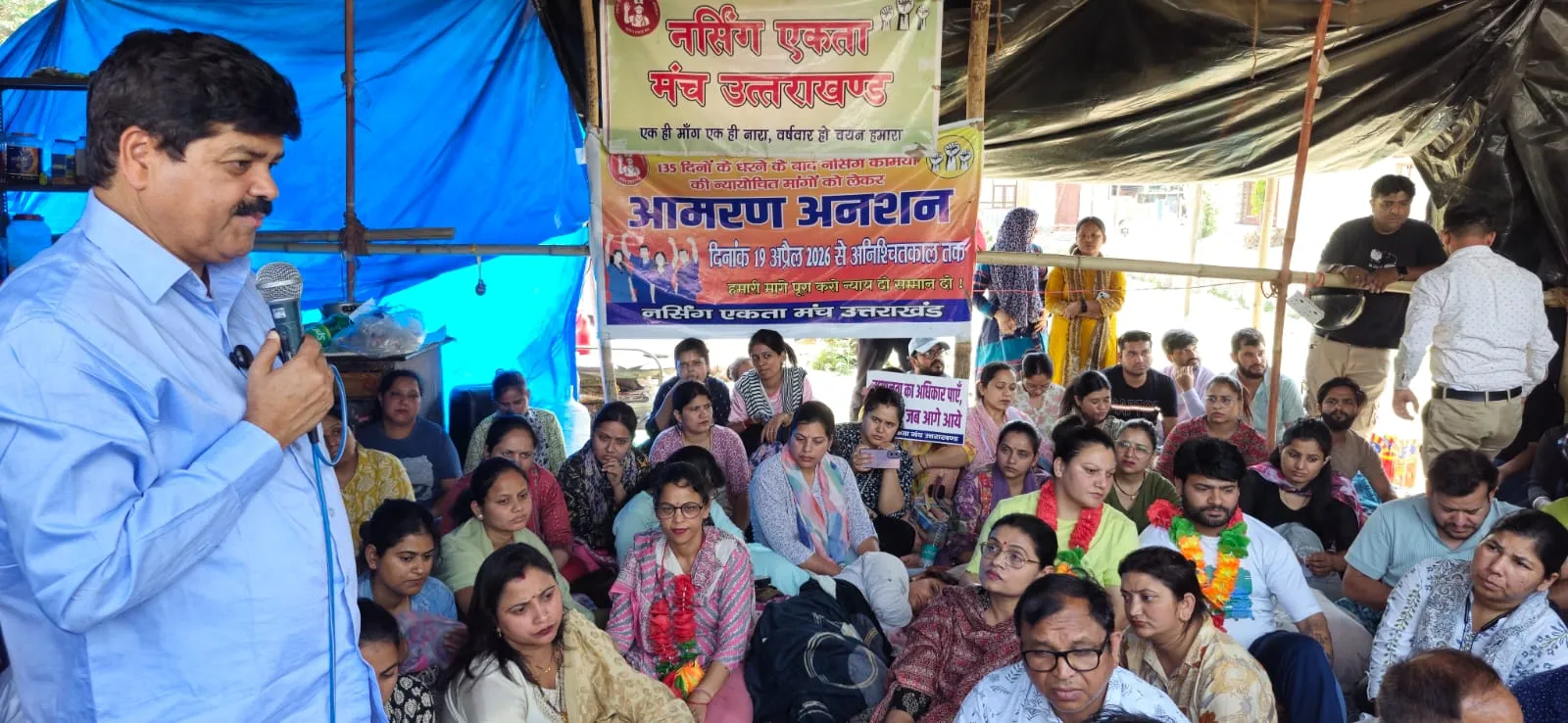 देहरादून(आरएनएस)। उत्तराखंड में नर्सिंग एकता मंच के बैनर तले नर्सिंगकर्मियों का आंदोलन लगातार जारी है। आज धरने का 141वां दिन है, जबकि आमरण अनशन छठे दिन में प्रवेश कर चुका है। अपनी मांगों को लेकर नर्सिंगकर्मी धरना स्थल पर डटे हुए हैं, लेकिन अब तक सरकार की ओर से कोई ठोस पहल सामने नहीं आई है। धरना स्थल पर आज प्रदेश कांग्रेस अध्यक्ष गणेश गोदियाल और महिला कांग्रेस की वरिष्ठ उपाध्यक्ष आशा मनोरमा डोबरियाल शर्मा पहुँचीं। उन्होंने आंदोलनकारियों को अपना समर्थन दिया। आशा शर्मा ने प्रदेश अध्यक्ष को नर्सिंगकर्मियों की मांगों से अवगत कराया और सरकार पर असंवेदनशील रवैया अपनाने का आरोप लगाया। इस दौरान उन्होंने कहा कि नर्सिंगकर्मियों की आवाज़ को लंबे समय से अनदेखा किया जा रहा है। नर्सिंगकर्मियों की प्रमुख मांग वर्षवार भर्ती प्रणाली लागू करने की है। उनका कहना है कि लंबे समय से भर्ती प्रक्रिया में अनियमितता के कारण योग्य अभ्यर्थियों का भविष्य अधर में लटका हुआ है।