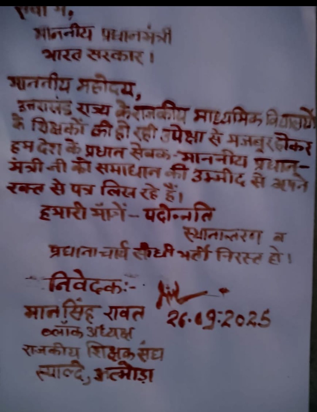 विकियासैण (अल्मोड़ा)।राजकीय शिक्षक संघ उत्तराखंड के आह्वान पर उत्तराखण्ड शिक्षक संघ ब्लाक स्याल्दे जिला अल्मोड़ा ने अपनी मांगों को लेकर प्रधानमंत्री को खून से लिखे पत्र भेजे हैं। राजकीय शिक्षक संघ लंबे समय से प्रधानाचार्य की सीधी भर्ती विरोध सहित शत-प्रतिशत पदोन्नति व क्रमवार स्थानांतरण आदि मांग को लेकर आंदोलनरत है। तथा अलग-अलग चरणों में आंदोलन चलाया जा रहा है। इसी क्रम में शनिवार को राजकीय शिक्षक संघ अपने खून से भारत के प्रधानमंत्री को पत्र उत्तराखंड सरकार को निर्देशित कर प्रधानाचार्य सीधी भर्ती को निरस्त करने, 50प्रतिशत पदोन्नति करते हुए शिक्षकों की सभी न्यायोचित मांगों का निस्तारण करने की पूरजोर मांग की है।