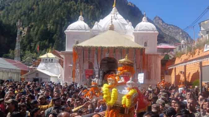 उत्तरकाशी। विश्व प्रसिद्ध गंगोत्री धाम के कपाट बुधवार को अन्नकूट पर्व पर विधिवत पूजा अर्चना के साथ अभीजीत मुहूर्त में ठीक 11: 36 मिनट पर शीतकाल के लिए बंद कर दिए गए। कपाट बंद होने के साथ ही मां गंगा की उत्सव डोली शीतकालीन पड़ाव मुखीमठ (मुखबा) के लिए रवाना हुई। डोली गुरुवार को मुखबा पहुंचेगी। जहां पर श्रद्धालु आगामी छह माह तक मां गंगा के दर्शन कर सकेंगे। बुधवार को गंगोत्री धाम के कपाट बंद होने की तैयारी सुबह 8:30 बजे शुरू हुई। सर्व प्रथम उदय बेला पर मां गंगा के मुकुट को उतारा गया। इस बीच श्रद्धालुओं ने मां की भोग मूर्ति के दर्शन किए।