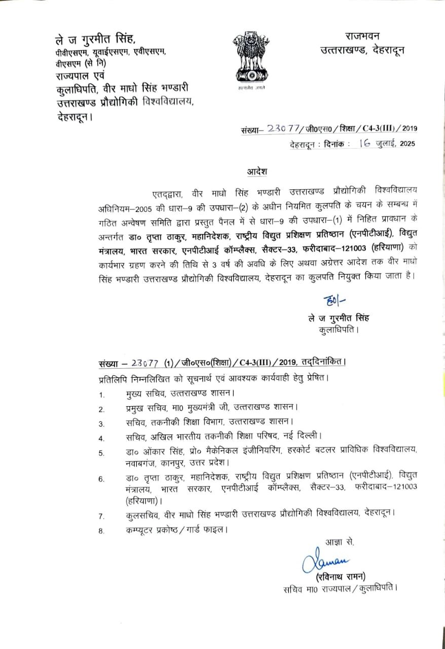 देहरादून – 16.07.25 – आखिरकार छात्रों का छह माह लम्बा संघर्ष रंग लाया ! राज्यपाल महोदय द्वारा उत्तराखंड तकनीकी विश्विद्यालय के विवादित कुलपति डॉ. ओमकार यादव की जगह आज राष्ट्रीय विद्युत् प्रशिक्षण प्रतिष्ठान, फरीदाबाद की महानिदेशक डॉ. तृप्ता ठाकुर को उत्तराखंड तकनीकी विश्विद्यालय की नई कुलपति नियुक्त कर दिया गया है !