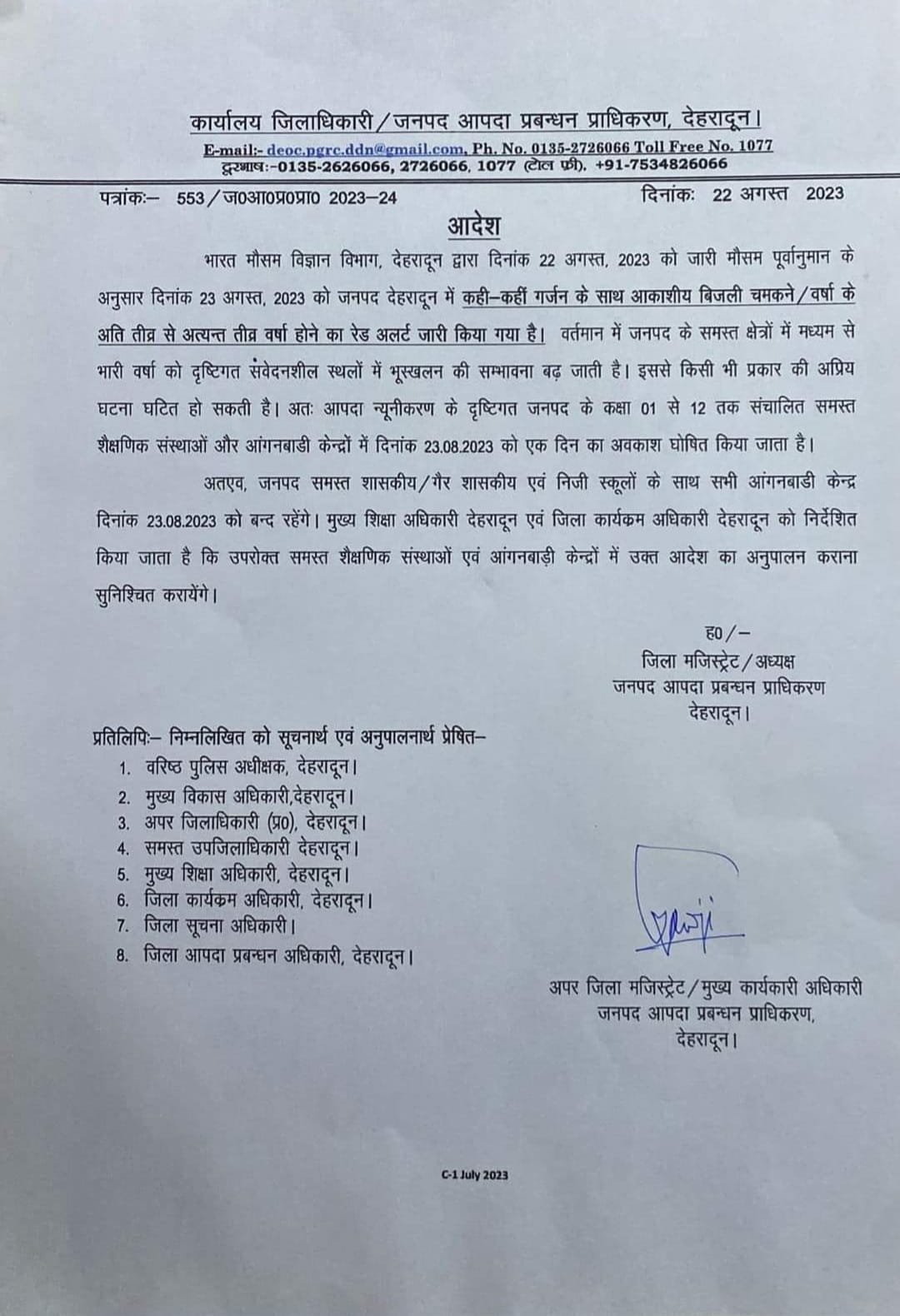 भारत मौसम विज्ञान विभाग, देहरादून द्वारा दिनांक 22 अगस्त 2023 को जारी मौसम पूर्वानुमान के अनुसार दिनांक 23 अगस्त, 2023 को जनपद देहरादून में कहीं-कहीं गर्जन के साथ आकाशीय बिजली चमकने / वर्षा के अति तीव्र से अत्यन्त तीव्र वर्षा होने का रेड अलर्ट जारी किया गया है। वर्तमान में जनपद के समस्त क्षेत्रों में मध्यम से भारी वर्षा को दृष्टिगत संवेदनशील स्थलों में भूस्खलन की सम्भावना बढ़ जाती है। इससे किसी भी प्रकार की अप्रिय घटना घटित हो सकती है। अतः आपदा न्यूनीकरण के दृष्टिगत जनपद के कक्षा 01 से 12 तक संचालित समस्त शैक्षणिक संस्थाओं और आंगनबाडी केन्द्रों में दिनांक 23.08.2023 को एक दिन का अवकाश घोषित किया जाता है।अतएव, जनपद समस्त शासकीय / गैर शासकीय एवं निजी स्कूलों के साथ सभी आंगनबाडी केन्द्र दिनांक 23.08.2023 को बन्द रहेंगे। मुख्य शिक्षा अधिकारी देहरादून एवं जिला कार्यक्रम अधिकारी देहरादून को निर्देशित किया जाता है कि उपरोक्त समस्त शैक्षणिक संस्थाओं एवं आंगनबाड़ी केन्द्रों में उक्त आदेश का अनुपालन कराना सुनिश्चित करायेंगे।