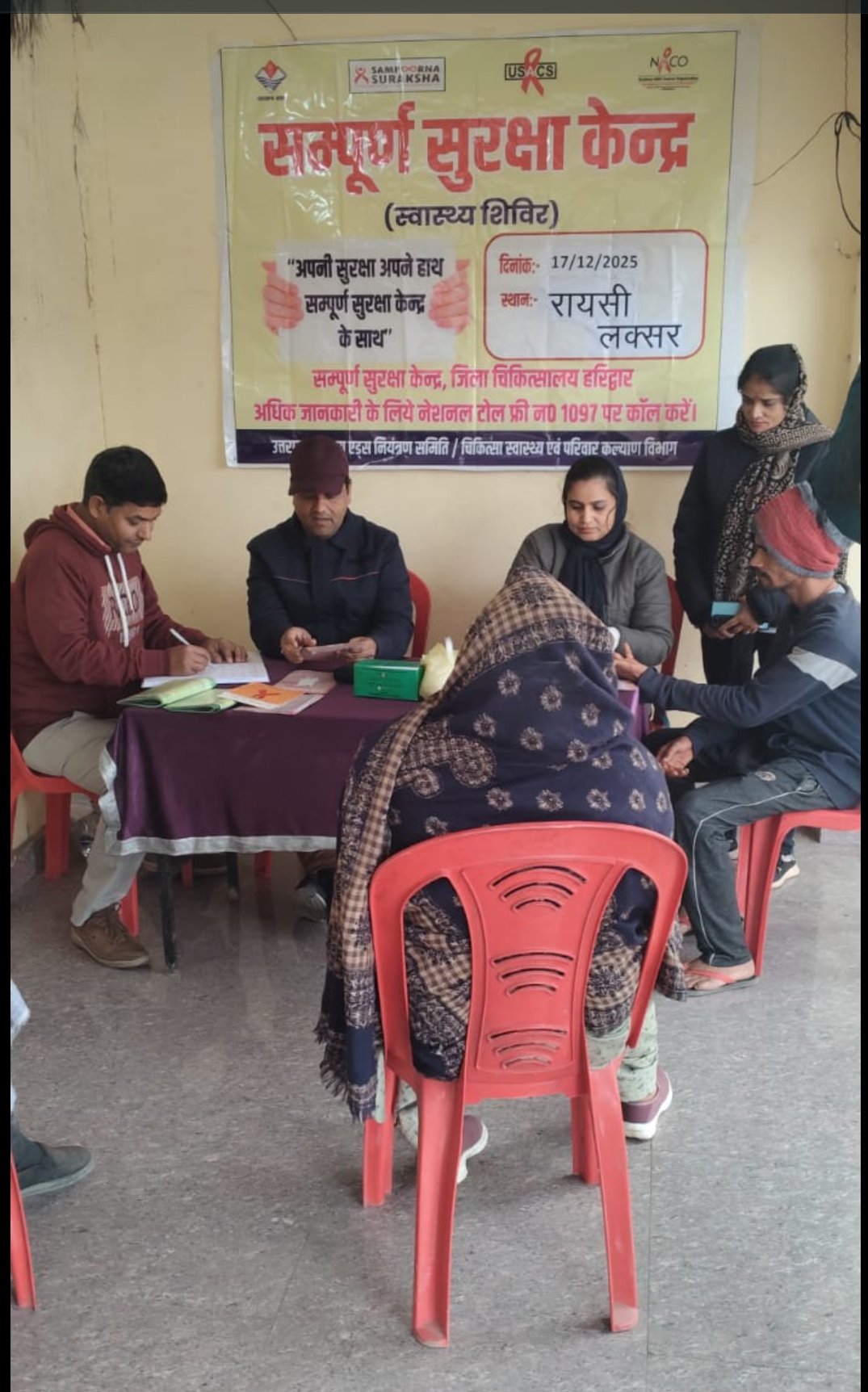 हरिद्वार( हमारी चौपाल )17 दिसंबर, 2025 को ग्रामीण क्षेत्र रायसी लक्सर, हरिद्वार में स्वास्थ्य शिविर (स्मॉल कैंप) का सफलतापूर्वक आयोजन किया गया। यह शिविर मुख्य चिकित्सा अधिकारी महोदय, जिला क्षय रोग अधिकारी महोदय एवं प्रमुख चिकित्सा अधीक्षक जिला चिकित्सालय हरिद्वार के निर्देशन में आयोजित किया गया। शिविर का संचालन सम्पूर्ण सुरक्षा केन्द्र (SSK) की ओर से किया गया।शिविर में सभी लाभार्थियों को HIV/AIDS, STI/RTI, Tuberclosis, Hepatitis B/C की पूर्ण जानकारी दी गई। साथ ही HIV/SYPHILIS, Sugar, BP की जाँचें निःशुल्क उपलब्ध कराई गईं। उपस्थित लाभार्थियों को सम्पूर्ण सुरक्षा केन्द्र (SSK) की सेवाओं, उद्देश्य तथा उपलब्ध सुविधाओं के बारे में विस्तृत जानकारी प्रदान की गई। इसके साथ ही लोगों को स्वास्थ्य संबंधी आवश्यक सुझाव, परामर्श एवं जागरूकता भी दी गई। शिविर में सम्पूर्ण सुरक्षा केन्द्र स्टाफ एवं ICTC/SSK Counsellor और DSRC Counsellor उपस्थित रहे।