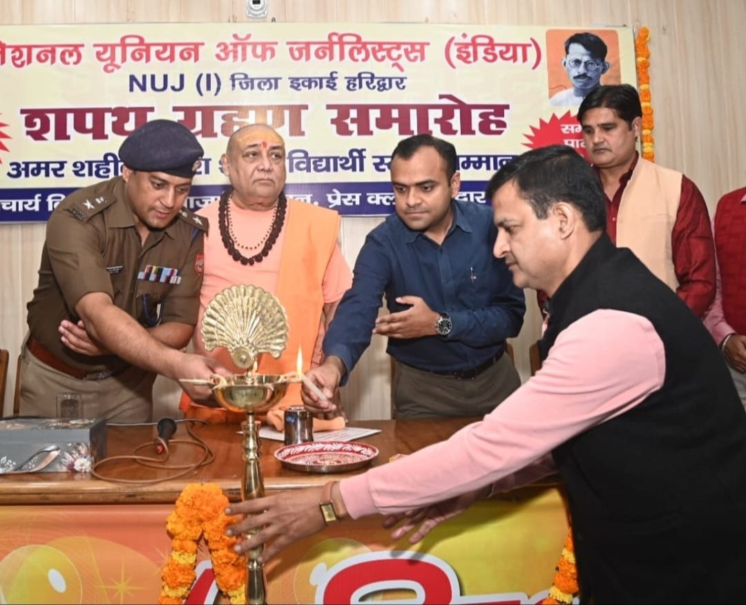 गौरतालाब है कि देश में पत्रकारों की सबसे बड़ी संस्था एन यू जे आई उत्तराखंड इकाई हरिद्वार की नवनिर्वाचित कार्यक्रम का शपथ ग्रहण समारोह एवीएन अमर शहीद गणेश शंकर विद्यार्थी सम्मान समारोह का आयोजन प्रेस क्लब हरिद्वार के सभागर में आयोजित किया गया | कार्यक्रम के अध्यक्ष जग्गू शंकराचार्य स्वामी राजराजेश्वर आश्रम के मुख्य अतिथि जिलााधिकारी मयूर दीक्षित एवीएन विशिष्ट अतिथि वरिष्ठ पुलिस अधीक्षक प्रमेंद्र दो बल ने नवनिर्वाचित कार्यकारिणी सदश्यों अध्यक्ष नरेश गुप्ता उपाध्याय राधिका नागरथ विकास कुमार झा महंत संदीप रावत कोषाध्यक्ष सचिन कुमार वरिष्ठ सचिव जोगेंद्र मावि सचिव प्रतिभा वर्मा सोमेश खत्री संगठन सचिव आशीष मिश्रा प्रचार सचिव नितिन राणा समारोह सचिव संजीव शर्मा विधि सलाहकार सुरेंद्र शर्मा एवीएन सदस्य कार्यकर्ता सदस्यों में अनिल चौधरी स्वरूप पुरी शिवांग अग्रवाल ठाकुर शैलेन्द्र सिंह संतोष कुमार कुमकुम शर्मा अनुप कुमार शमशेर बहादुर नीलम सैनी निशा शर्मा दिव्यांश शर्मा वैभव भाटिया करण खुराना विशिष्ट सिंह एवीएन गोपनियता की शपथ दिलाई | वाही मनोज कपिल डीएवी प्रधानाचार्य शांतनु मंगलेक स्केटिंग चैंपियन अवनीश प्रेमी पत्रकार स्वरूप पुरी पत्रकार अंकुर अग्रवाल रोटरी क्लब रानीपुर कल्पना गहलोत यातायत प्रबंधक के लिए अमर शहीद गणेश शंकर विद्यार्थी सम्मान पुरस्कार से सम्मानित किया गया मौके पर जिलाअधिकारी मयूर दीक्षित ने कहा कि पत्रकारों को पारदर्शिता से काम करना चाहिए | उनके लेखन का समाज पर गहरा असर पड़ता है पत्रकार शासन प्रशासन के लिए भी प्रति प्रस्तुतीकरण की भूमिका का निर्वाह करते हैं एसएसपी प्रेमेंद्र डोबाल ने अपने संबोधन में गणेश शंकर विद्यार्थी को महात्मा गांधी के पद चिन्हों पर चलने वाला अहिंसावादी महान पत्रकार बताते हुए कहा कि हिंदी पत्रकारिता के क्षेत्र में प्रारम्भिक अलख जगने के साथ नया आयाम दिया वही काई पत्रकारों को पत्रकरिता के पद पर चलने की प्रेरणा दी उनके योगदान को बुलाया नहीं जा सकता और मैं के प्रदेश अध्यक्ष सुनील दत्त पांडे ने कहा कि हर साल क्रांतिकारी गणेश शंकर विद्यार्थी जयंती और सम्मान समारोह मनाने की परंपरा समाज में उनके योगदान को आमजन के बीच स्मरण कराती है जो प्रशंसनीय है प्रेस क्लब अध्यक्ष धर्मेंद्र चौधरी ने कहा कि पत्रकारिता के क्षेत्र में प्रेस क्लब की अपनी पहचान है एन यू जे आई श्रमजीवी पत्रकार यूनियन सहित अन्य प्रतिष्ठित संगठन प्रेस क्लब से जुड़े हैं उन्हें गर्व है कि एन यू जे आई उत्तराखंड इकै हरिद्वार के सदस्य के नाते प्रेस क्लब हरिद्वार के अध्यापक प्रति सेवाएँ दे रहे हैं संस्था के नि वर्तमान महामन्त्री शिव अग्रवाल ने गणेश शंकर 