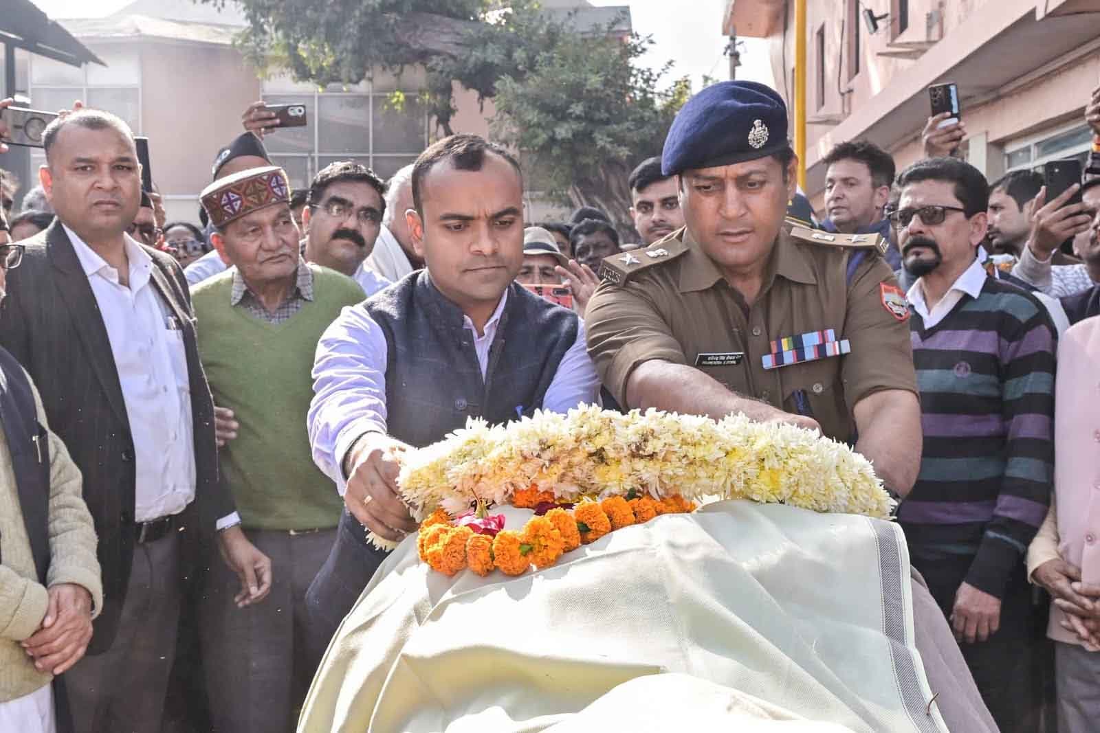 हरिद्वार(आरएनएस)। उत्तराखंड राज्य आंदोलन के अग्रणी सेनानी एवं पूर्व कैबिनेट मंत्री दिवाकर भट्ट जी के निधन पर मुख्यमंत्री पुष्कर सिंह धामी ने गहरी संवेदना व्यक्त करते हुए जनपद हरिद्वार सभी सरकारी कार्यालय में अवकाश रखने का आदेश जारी किए गए। मुख्यमंत्री की ओर से दिवंगत नेता के प्राथिव शरीर पर जिलाधिकारी मयूर दीक्षित एवं वरिष्ठ पुलिस अधीक्षक प्रमेंद्र सिंह डोभाल ने पुष्पचक्र अर्पित कर उन्हें नमन करते हुए अंतिम विधाई दी। श्री भट्ट को गार्ड ऑफ ऑनर के साथ अंतिम सलामी दी गई तथा राजकीय सम्मान के साथ उनका दाह संस्कार 02 बजे खड़खड़ी शमशान घाट पर किया गया तथा श्री भट्ट को उनके पुत्र ललित भट्ट ने मुख्याग्नि दी।इस अवसर पर दिवंगत नेता श्री दिवाकर भट्ट जी की अंतिम दर्शन एवं अंतिम यात्रा में विभिन्न जनपदों से जनप्रतिनिधि,विभिन्न संगठनों के पदाधिकारी सहित आम लोग शव यात्रा में शामिल रहे।