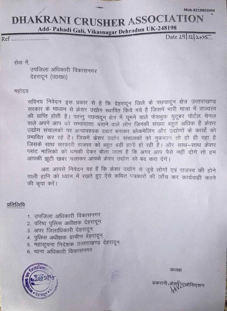 देहरादून , विकासनगर। ढकरानी क्रेशर एसोसिएशन ने पछवादून क्षेत्र में संचालित क्रेशर उद्योगों पर तथाकथित पत्रकारों व सोशल मीडिया यूट्यूब चैनल संचालकों द्वारा की जा रही अवैध वसूली, ब्लैकमेलिंग और धमकियों के गंभीर आरोप लगाते हुए उपजिलाधिकारी, वरिष्ठ पुलिस अधीक्षक सहित जिला प्रशासन के आला अधिकारियों से तत्काल जांच व कठोर कार्रवाई की मांग की है।