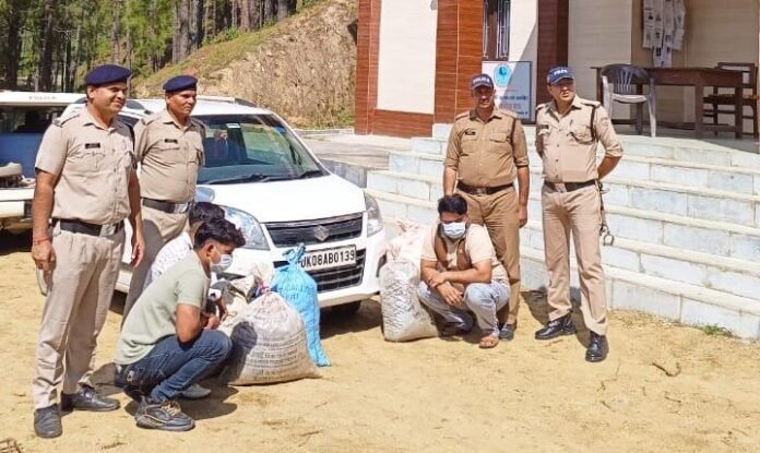 जानकारी के अनुसार बीते रोज थाना थलीसैंण पुलिस को सूचना मिली कि क्षेत्र में कुछ नशा तस्कर नशीले सामान की डिलीवरी करने आने वाले है। सूचना पर कार्यवाही करते हुए पुलिस ने क्षेत्र में चौंकिंग अभियान चला दिया। इस दौरान पुलिस को बैजरो पुल पर एक संदिग्ध कार आती हुई दिखायी दी। पुलिस ने जब उसे रूकने का इशारा किया तो कार सवार चालक कार छोड़कर भागने लगा। इस पर उन्हे घेर कर दबोचा गया। कार की तलाशी के दौरान उसे 5 प्लास्टिक के कटाे में रखा 60 किलो 418 ग्राम गांजा बरामद हुआ। पूछताछ में चालक ने अपना नाम कपिल कुमार ,निवासी नजीबाबाद बताया। बताया कि बताया कि मेरे दो अन्य साथी शिवम निवासी पुरनपुर बढापुर बिजनौर व भूपेन्द्र सिंह निवासी बिजनौर, रास्ते में ही रूक गये हैं। जिस पर पुलिस द्वारा त्वरित कार्यवही करते हुए दोनों आरोपियों को तलाश कर मौके पर पकड़ लिया। पुलिस ने उनके खिलाफ एनडीपीएस एक्ट की धाराओं में गिरफ्तार कर न्यायालय में पेश किया जहां से उन्हे जेल भेज दिया गया है।